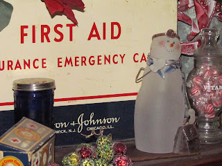 I also have a love of snowmen. .look at this little glass one with the wire stethescope and doctor bag, given to me as a gift! I like to add little touches of color to things. .like the little round mints I bought on clearance one year after Christmas. I added them to an old glass vitamin jar. The jar is high enough that the little mouths around here can't get to the mints to eat them, and I recycle them from year to year!!